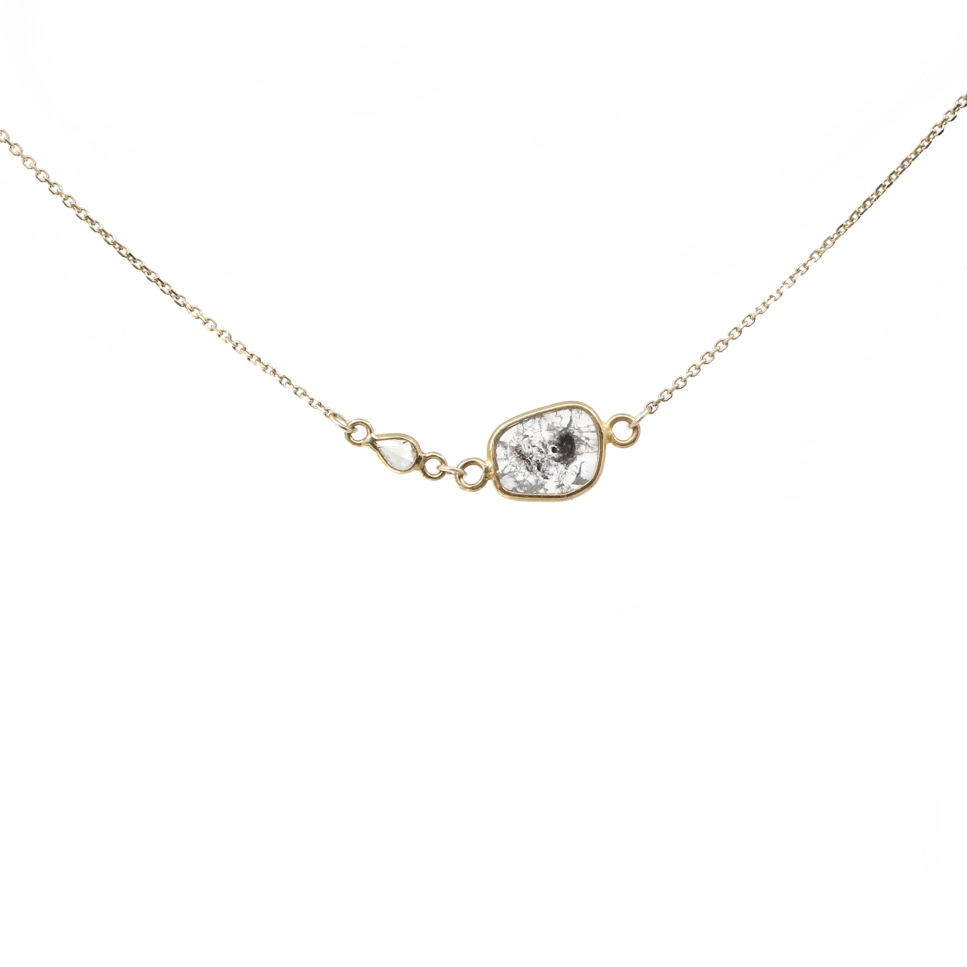 This double diamond necklace is a "one of a kind" piece. The main diamond is a perfectly imperfect and conflict free natural diamond slice. The accenting diamond is a natural pear shaped rose cut diamond. Diamonds are wrapped in 18k yellow gold and hang from a 14k yellow chain.