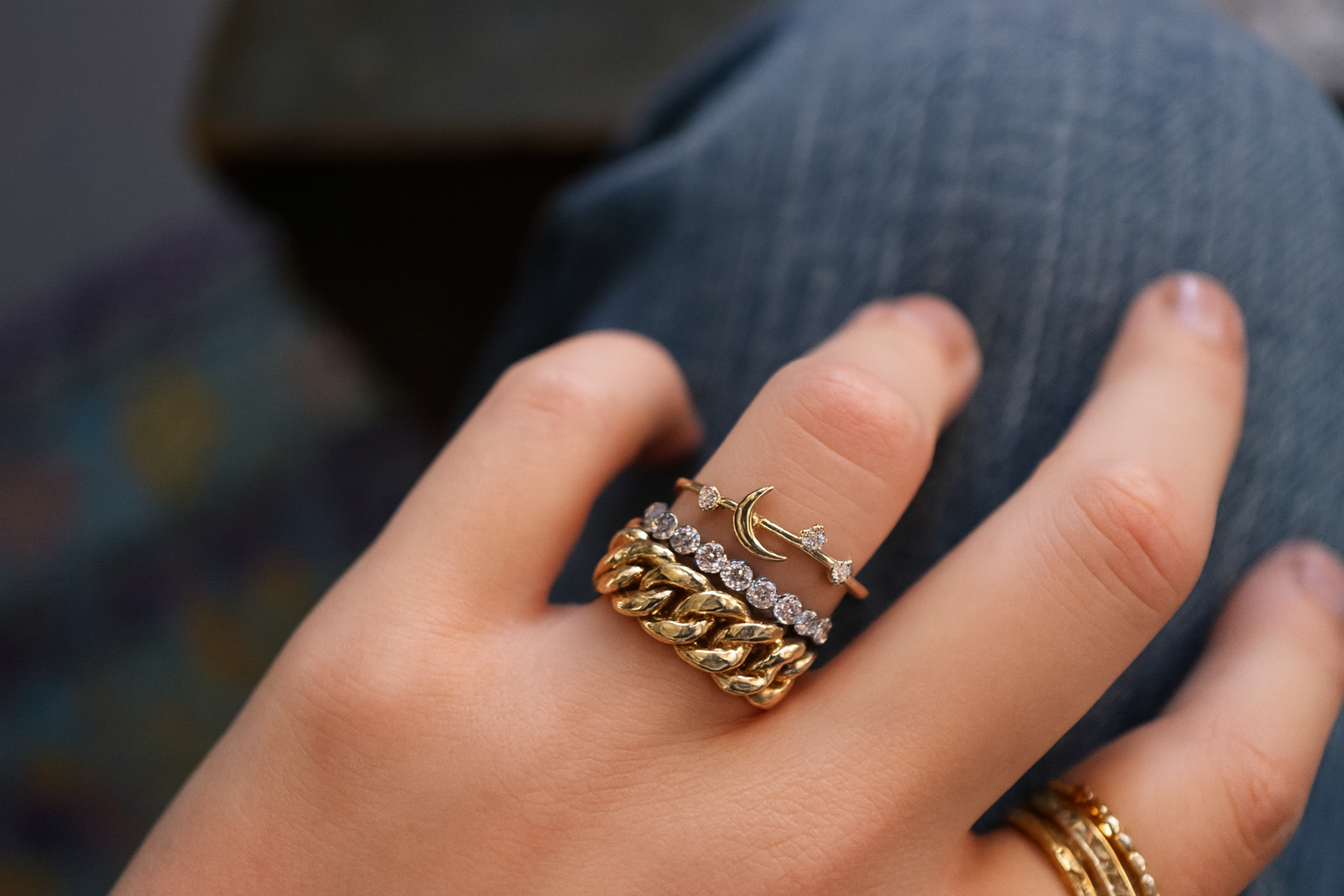 Crafted in solid 14k gold, this celestial design features round brilliant-cut natural diamonds totaling 0.09 carats. Each piece is made to order with care in our Milwaukee studio and ships within 2–3 weeks.