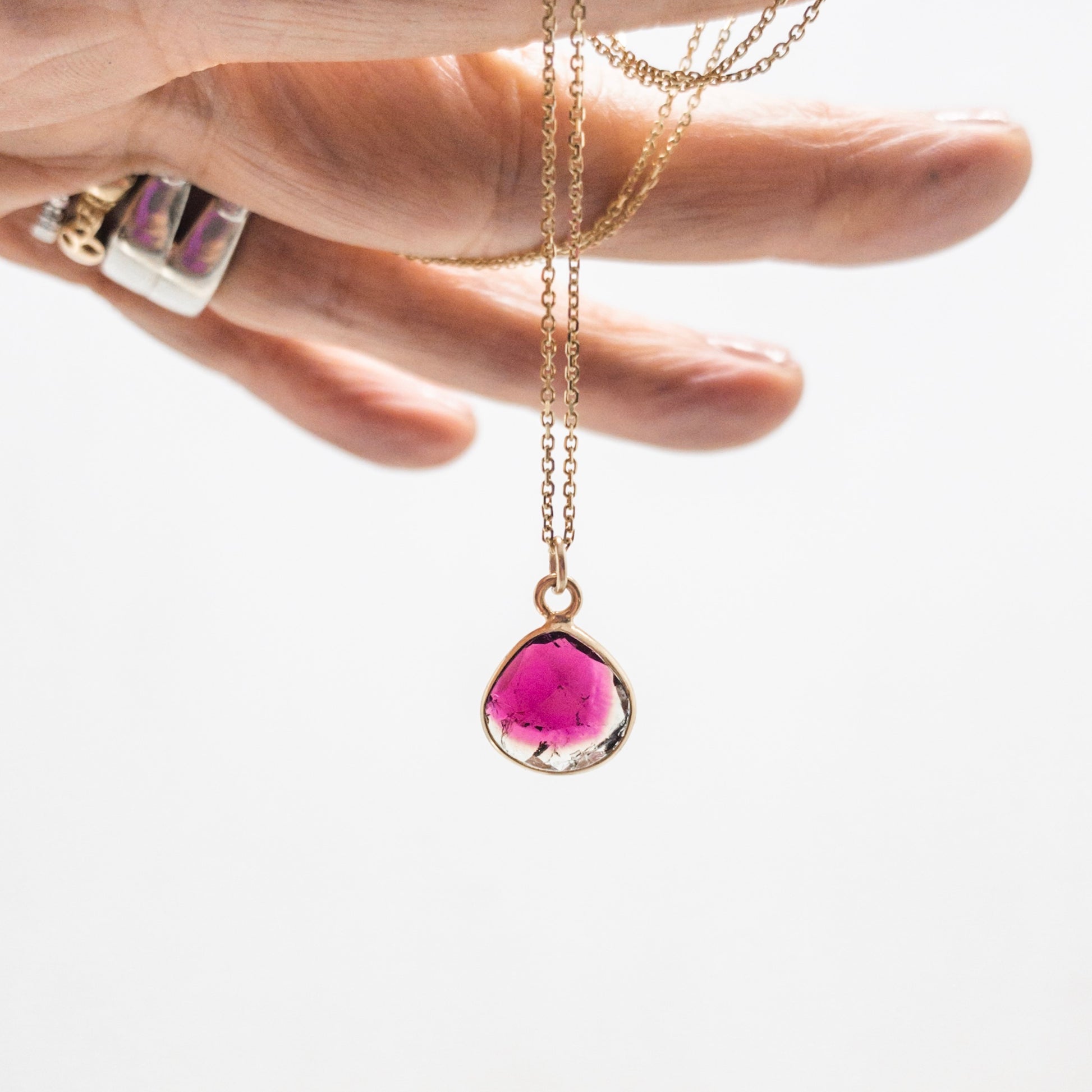 This one of a kind Watermelon Tourmaline Slice is wrapped in 18k yellow gold and hangs from a 16” 14k yellow gold chain.